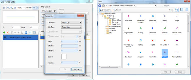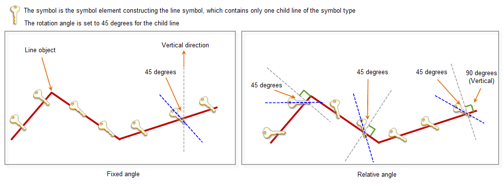 The following figure mainly illustrates the difference between the two types of sub-lines of Custom Symbols (relative angle) and Custom Symbols (fixed angle). The two types of sub-lines are the sub-lines of Symbol Type. The difference is:
