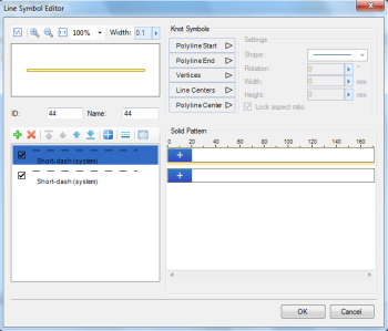 - In the Line Symbol Selector, select any linetype symbol and click the Edit button, or double-click the linetype symbol to open the Linear Symbol Editor. The sub-line list of the selected linear symbol is displayed in the lower left area of the Linear Symbol Editor. The user can modify each sub-line to edit the selected symbol;