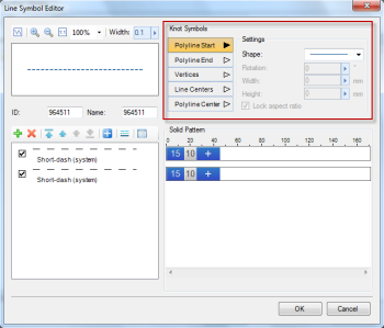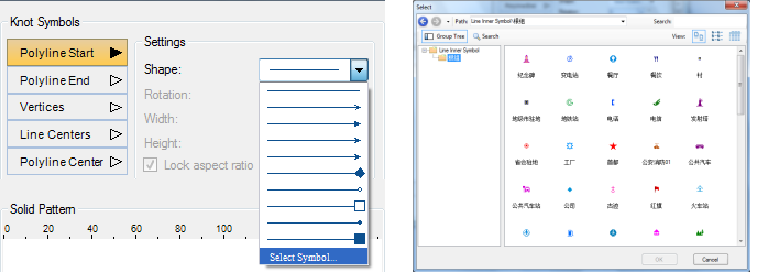 As shown in the figure below, these buttons list the End Symbol types of all the sublines provided. Select the button corresponding to the end Symbol Type to be added. At this time, the End Symbol can be set in the lower area, including: specify the symbol as the End Symbol. Set the height, width, Rotation angle, etc. Of the symbol. The settings in this area will be applied to the selected end Symbol Type.