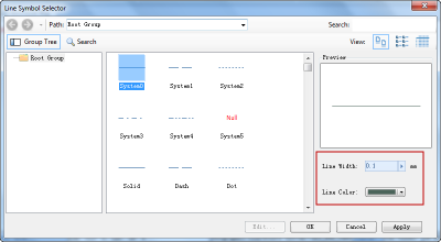In the Symbol Style Settings area of the Line Symbol Selector, you can perform Style Settings on line symbols, including the line width and color of line symbols.
