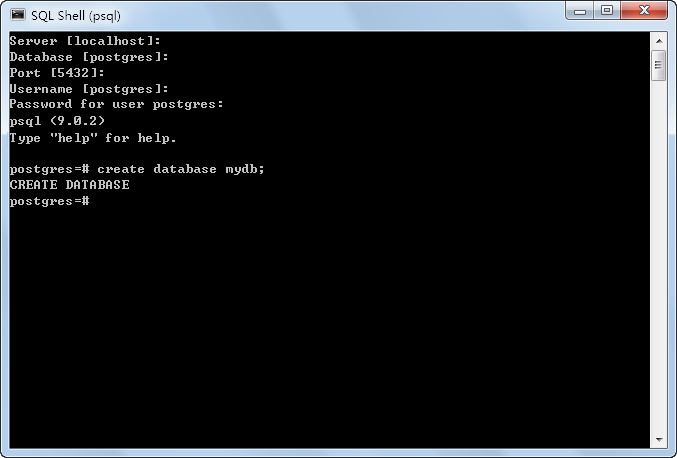 Start the SQL Shell tool for PostgreSQL, as shown in the following figure. After successful login, you can type the SQL statement to create the database.