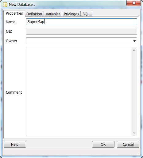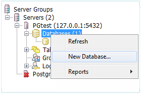 - As shown in the following figure, right click the Database group of the started database server, and click the New Database.. "Menu to pop up the New Database" page window, and then a new database named SuperMap can be created. See the Modify Configuration file