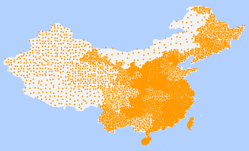 - Dot Density Map uses the number of points or Density to reflect the thematic value corresponding to an area or range, where a point represents a certain number, and the number of points in an area multiplied by the number represented by the point is the thematic value corresponding to the area. For example, if a city has 2000000 population and one point in the Dot Density Map represents 20000 population, there will be 100 points distributed within the city area.