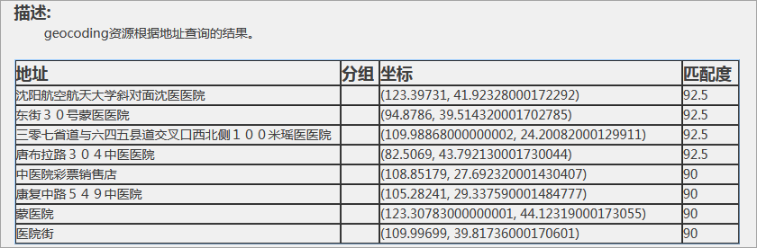 以下以访问geocoding 服务为例,根据地点名称关键词,此处以“医院”作为查找地址位置,可设置查询的分组信息,例如“沈阳,新区”等,在生成地址索引时设置的最大结果数为8,则结果列表中只显示8个查询结果,如下图所示。