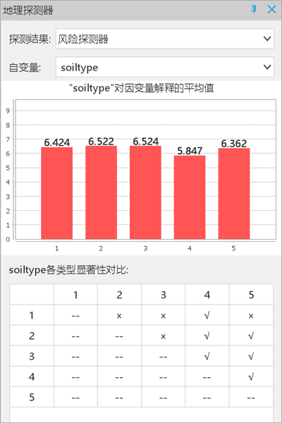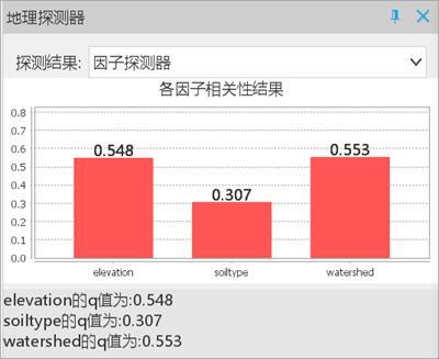 所有探测器结果将生成新的属性表数据集存储至数据源中,同时在右侧地理探测器面板中输出分析结果,下面将对各探测器结果进行分析: