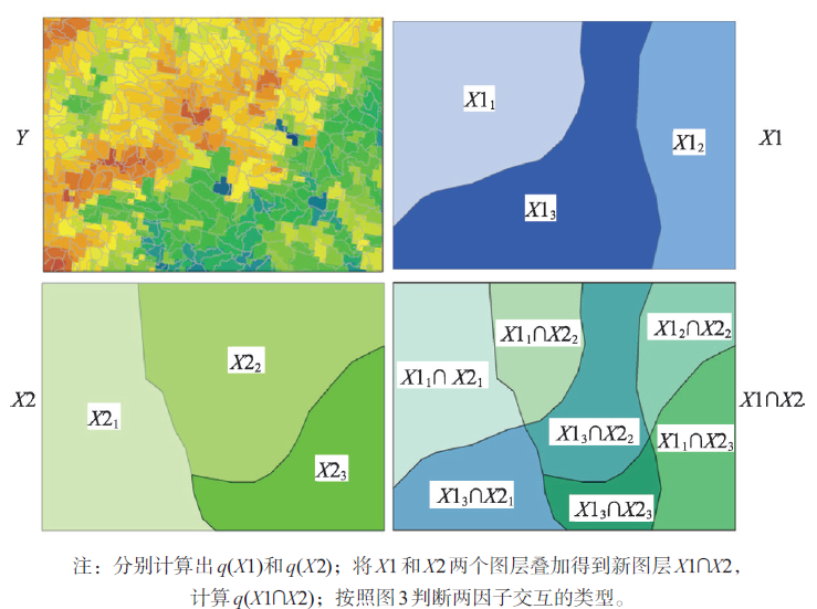 识别不同风险因子Xs之间的交互作用,即评估因子X1和X2共同作用时是否会增加或减弱对因变量Y的解释力,或这些因子对Y的影响是相互独立的。评估的方法是首先分别计算两种因子X1和X2对Y的q值:q(X1)和q(X2),并且计算它们交互(叠加变量X1和X2两个图层相切所形成的新的多边形分布)时的q值: q(X1∩X2),并对 q(X1)、 q(X2)与 q(X1∩X2)进行比较。两个因子之间的关系可分为以下几类: