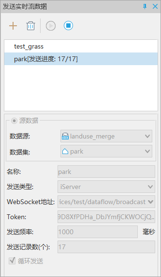 参数设置完成,开始发送实时流数据,将在界面右侧 发送实时流数据 浮动窗口中显示发送状态,通过工具条上的按钮可以添加、删除、开始和停止发送。