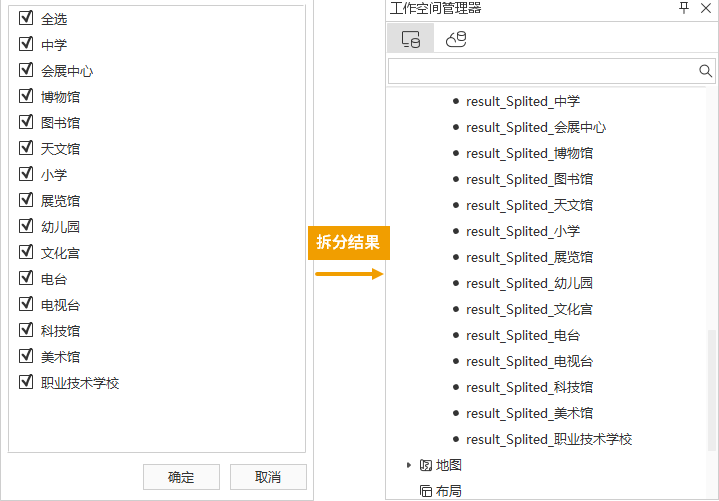 提示:根据拆分字段的属性类别,结果数据将生成对应类别数的数据集,例如,当按照省级行政区划对数据集进行拆分,将得到34个结果数据集,每个省级区域都将有独立的数据集。
