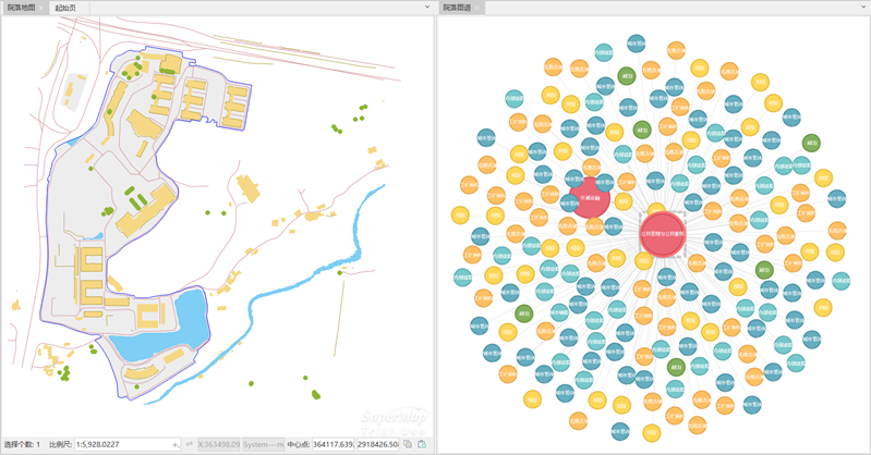 SuperMap iDesktopX 支持图谱与地图关联浏览,当在地图中选中某个对象时,在图谱窗口中高亮显示对应节点。若图谱中无相关节点,会在输出窗口提示:目标图谱中未找到地图对应对象。