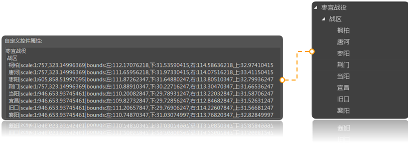 在大屏中添加自定义面板,控件类型设置为树控件,在自定义控件属性中设置树控件的层级、名称、地图比例尺和显示范围,一个格则表示缩进一级,通过scale和bounds属性来设置地图的比例尺和显示范围。设置方式如下: