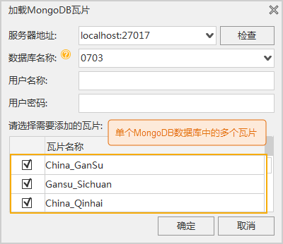 - 添加 MongoDB 瓦片:使用该功能前,需先启动MongoDB服务,请参看“MongDB 使用说明”启动服务。选择添加MongoDB瓦片(不支持矢量瓦片),需在添加 MongoDB 瓦片对话框中输入MongoDB服务器地址、数据库名称、用户名称、用户密码信息,可通过服务器地址右侧的检查按钮,检查服务器是否可用;可添加该数据库下的多个瓦片数据,并支持在列表中查看该数据库下的多个瓦片,并选择要加载的的瓦片。