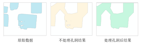 - 洞限定面积:设置聚合结果面内部孔洞的最小面积,即小于该面积的孔洞将被填满。面积单位与聚合限定距离单位一致,例如上列单位选择为米,则这里的面积单位为平方米。默认值为0,即保留所有面要素中的孔洞。