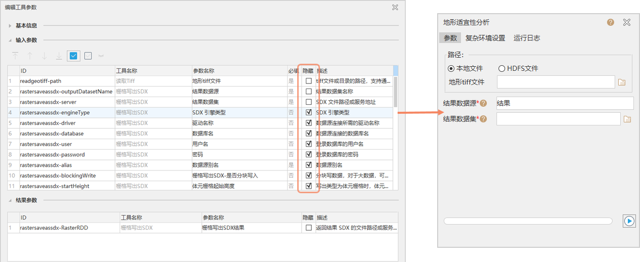 进一步通过选择模型工具右键菜单中的编辑模型,展开模型工具进行编辑,选择编辑工具参数不仅可以编辑参数名称和描述,而且可以批量隐藏参数,将不需要设置或者修改的参数进行隐藏,以简化模型工具参数面板中的参数设置,提高模型工具的易用性。