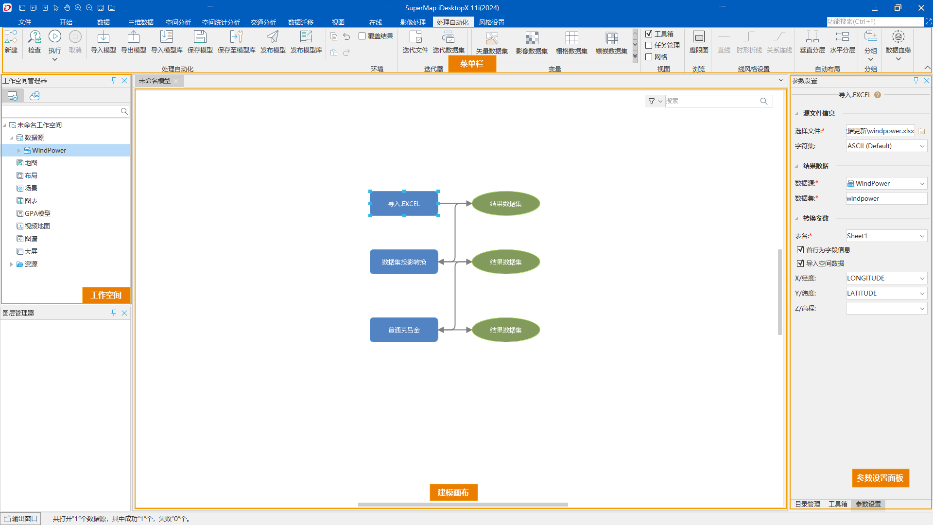 处理自动化建模页面顶部为菜单栏,左侧为工作空间,中间为可视化建模画布,右侧可灵活切换参数面板和工具箱。整体界面如下: