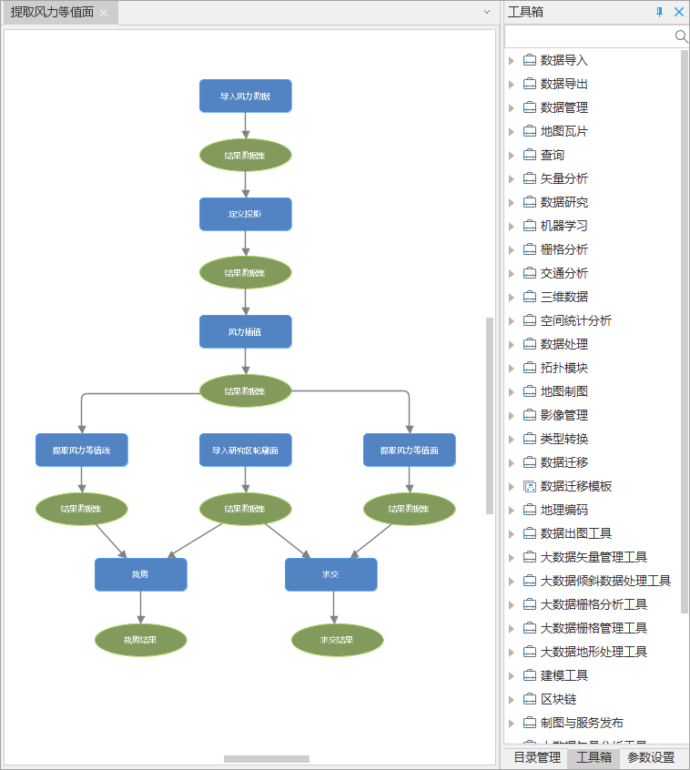 下图中的应用实例为:根据气象站点数据提取某区域风力等值面。模型会依次执行以下工具: