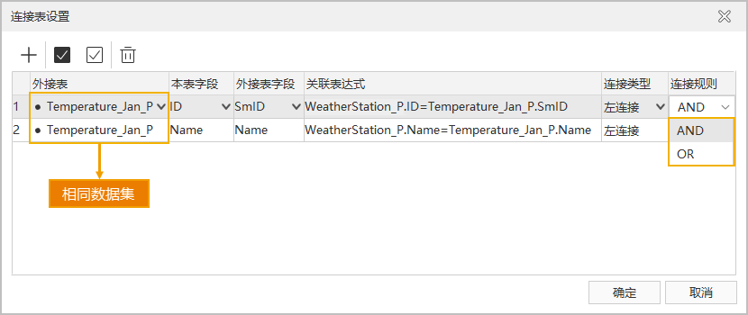 - 连接规则:当对同一外接表添加了多个连接条件时,可双击前一条记录连接规则的单元格,在下拉按钮中设置其与后一个连接条件的关系。提供了AND和OR两种连接规则,详细说明如下: