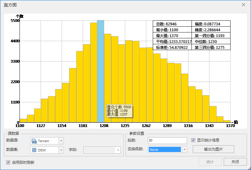直方图的横轴(X 轴)代表了每个样点的取值情况,纵轴(Y 轴)代表了样点个数。直方图右上角显示了所有样点的统计结果,统计内容包括样点总数、最小值、最大值、平均值、标准差、峰度、第一四分值、中位数、第三四分值共10项内容。