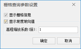 查询鼠标所在位置的栅格值时,可设置查询结果的是否显示栅格信息和坡度坡向值,同时可设置高程缩放系数等参数。