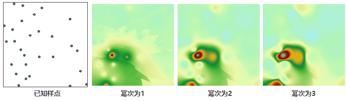 - 幂次:幂次与权重距离的计算有关,幂指数对 IDW 的插值结果有很大影响。幂次值越低,插值结果越平滑;幂次值越高,插值结果细节越详细。默认幂次为2。