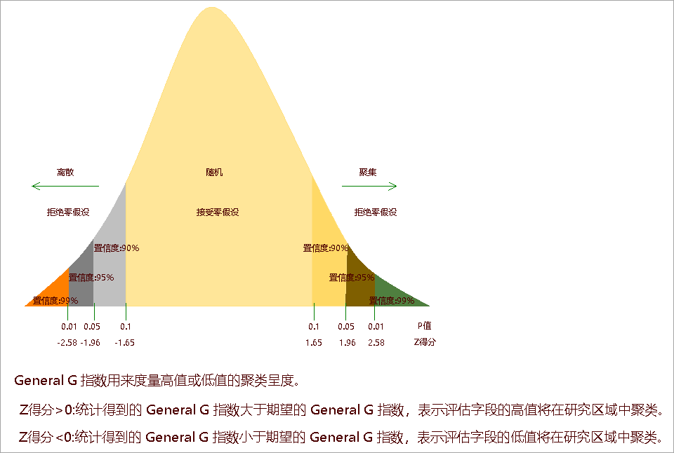高低值聚类分析结果包括:General G指数、期望值、方差、Z得分、 P值五个参数。高低值聚类分析是一种推论统计,这意味着分析结果将在零假设的情况下进行解释。分析结果返回的 p 值较小且在统计学上显著,则可以拒绝零假设。如果零假设被拒绝,则 z 得分的符号将变得十分重要,若 z 得分值为正数,则观测的 General G 指数会比期望的 General G 指数要大一些,表明属性的高值将在研究区域中聚类;若 z 得分值为负数,则观测的 General G 指数会比期望的 General G 指数要小一些,表明属性的低值将在研究区域中聚类。如下图所示: