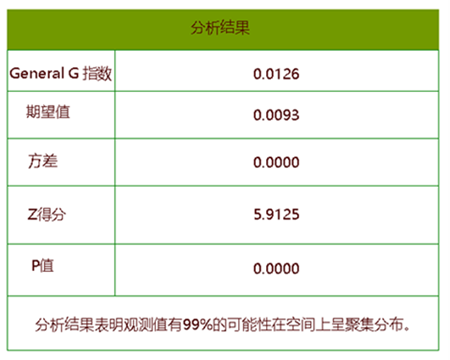 在随机分布的假设下,P值 < 0.01 且 z得分 > 2.58, 该省当年肝炎发病数的分析结果具有99%的置信度是具有显著性的。General G 值高于期望 GeneralG 指数且Z值显著,观测值发病数呈现高值聚集,说明发病数在高值区域呈现聚类。