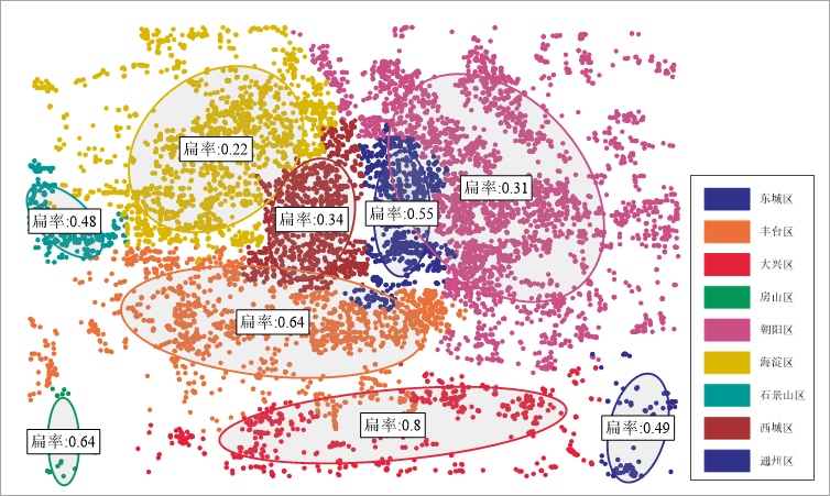 通过方向分布分析得到的某市各区县医疗点(Medical)分布趋势,如下图所示。其中大兴区的标准差椭圆扁率(0.8)最大,表示该区域的医疗点分布的方向性最为明显。