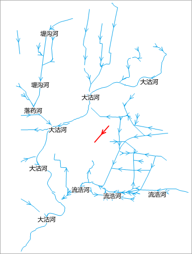 下图为山东平度市和即墨市交界处部分河流和支流,通过计算线型方向平均值对这些河流的方向进行度量和描述。计算得到的结果为图中的红色线段。该线段以所有河流的质心的平均中心点为其中心,线段的长度等于所有河流的平均长度,而且其方位或方向为所有河流的平均方位或平均方向。
