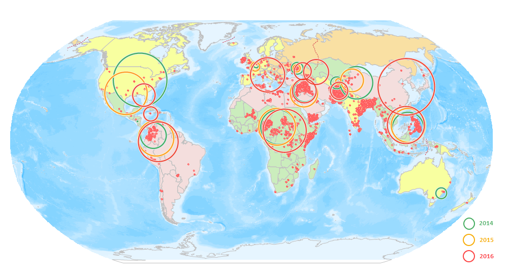 下图对比了2014年、2015年、2016年各地区恐怖袭击事件发生的离散程度,及恐怖袭击事件的中心点变化。图中绿色、橙色、红色分别表示2014、2015、2016年结果,以南美为例,对比结果可知2015年恐怖袭击事件比2014年离散程度要大,而2016年的离散程度比2015年要大,说明恐怖袭击事件影响区域在变大。