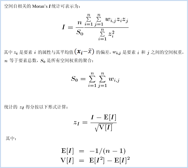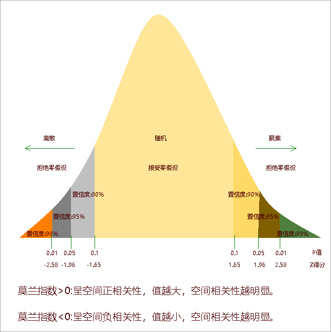 空间自相关 (Global Moran's I) 工具计算了指数值后,将计算期望指数值。然后,将期望指数值与观察指数值进行比较。在给定数据集中的要素个数和全部数据值的方差的情况下,该工具将计算 z 得分和 p 值,用来指示此差异是否具有统计学上的显著性。指数值不能直接进行解释,只能在零假设的情况下进行解释。