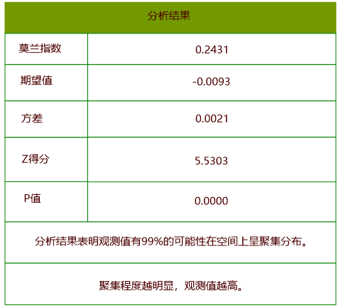 空间自相关分析结果包括:Moran's I 指数、期望值、方差、Z得分、 P值五个参数。使用 z 得分或 p 值指示统计显著性时,可以拒绝零假设,如果 Moran's I 指数值为正值,就表示这份数据具有空间正相关性,数据集用于分析的值与空间聚集度成正比;如果 Moran's I 指数值为负则指示离散趋势。如下图所示: