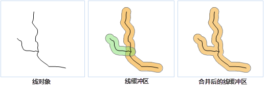线的缓冲区是沿线对象的法线方向,分别向线对象的两侧平移一定的距离而得到两条线,并与在线端点处形成的光滑曲线(或平头)接合形成的封闭区域。同样,当缓冲距离足够大时,两个或多个线对象的缓冲区可能有重叠。合并缓冲区的效果与点的合并缓冲区相同。