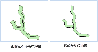 当线数据的缓冲类型设置为平头缓冲时,线对象两侧的缓冲宽度可以不一致,从而生成左右不等缓冲区;也可以只在线对象的一侧创建单边缓冲区,如下图所示: