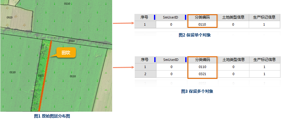 例如:以下图1为例,田坎在分类编码为0321和0110两个图斑的交界处,现需要算出图斑的净面积,先算出图斑面积,需扣除线状田坎面积,线状田坎在图斑边缘,线状田坎的面积是只扣一半的,通过求交操作,若勾选“单一对象”则返回结果田坎只属于其中一个图斑如图2所示,如不勾选,则返回结果同时保留两个线对象如图3所示,再通过指定图斑ID,扣除对应图斑中线状地物面积,即可得到净面积的结果。