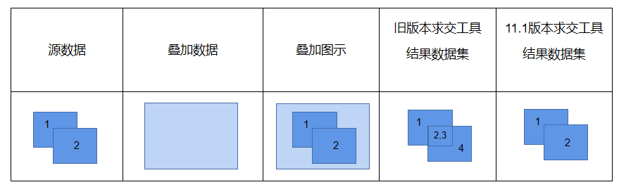 11.1版本求交工具进行了算法重构,性能较之前版本有了极大提升,与原算法不同在于当源数据集中对象存在重叠面时,输出结果对象数存在差异(如下图所示)。