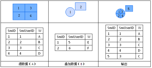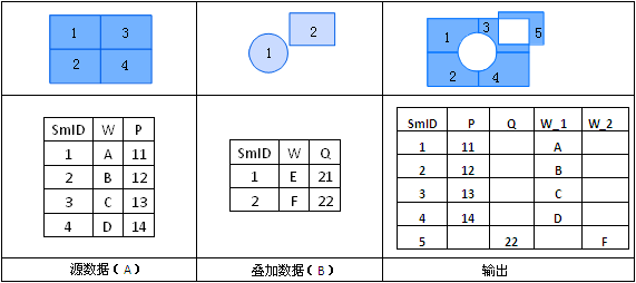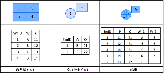 合并运算的输出结果的属性表来自于两个输入数据集属性表,在进行合并运算的时候,用户可以根据自己的需要在A、B的属性表中选择需要保留的属性字段。