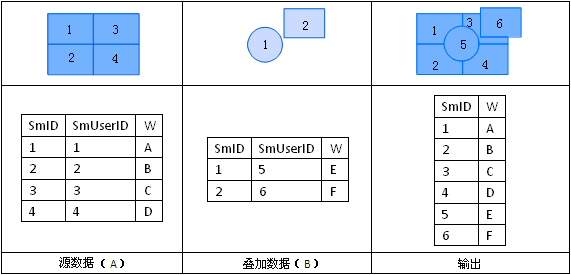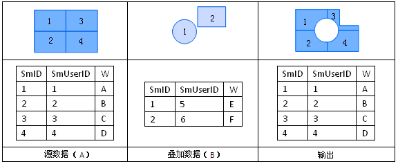 更新运算输出结果的属性表如下图所示,A、B数据集几何对象重合部分的属性值更新为B的属性值。