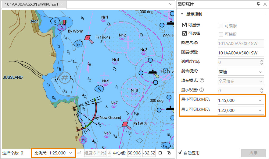- 在图层属性面板中查看并调整可见比例尺。您可以通过缩放地图窗口至适当比例尺范围,使海图正常显示。