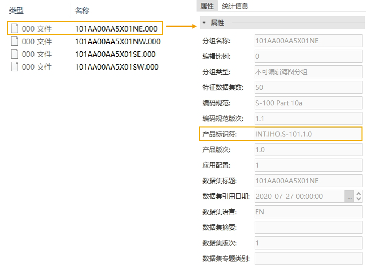 - 数据内容和格式:S-101 规定了电子海图数据编译内容、结构、数据编码和元数据等,数据储存格式为 *.000 文件,对应着 SuperMap iMaritimeEditor 中的海图分组,海图分组下包含海图特征数据集。如下图所示,符合 S-101 规范的 *.000 数据属性通常包括名称、特征数据集数量、编码规范和数据集引用日期和产品标识符等信息。