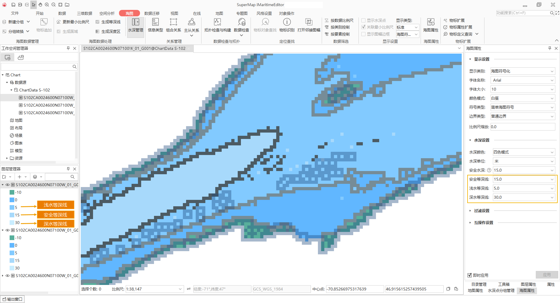 - 设置好以上参数后,单击导入按钮,即可完成 S-102 海图数据的导入。数据将以栅格数据的形式显示在工作空间管理器对应的数据源下。