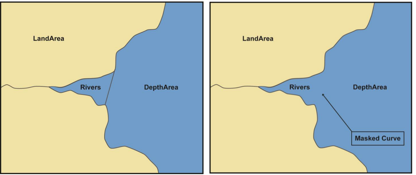- 其中,屏蔽掩码是指通过特定的机制来隐藏或抑制某些地理要素的显示,以避免这些要素在地图上产生干扰或显示不必要的信息。如下图左图中,河流由多个面对象构成,右图则在对象邻接处将掩码类型设置为屏蔽,即可将邻接处的线段隐藏显示。