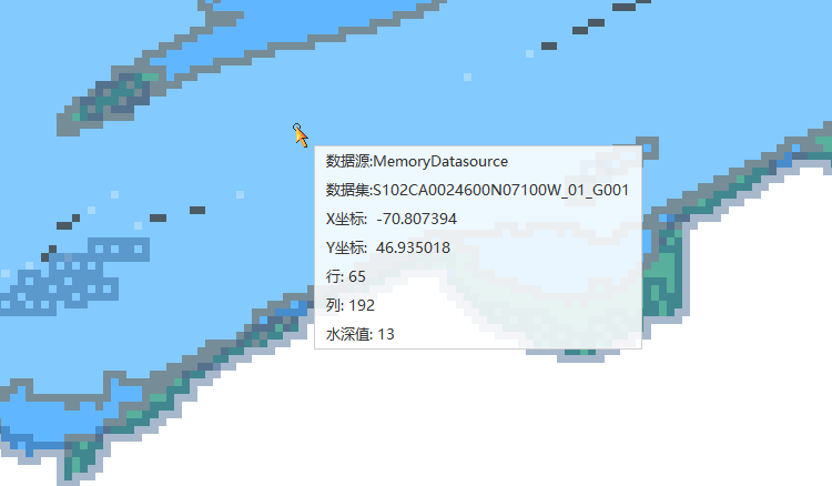 单击查询水深按钮后,将鼠标移动到地图窗口中,鼠标下方将显示鼠标位置的数据信息,包括:数据源、数据集、X坐标、Y坐标、行、列、水深值。