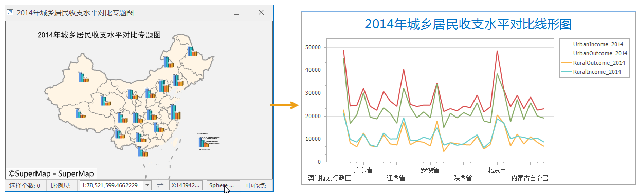 示例:下图为将2014年城乡居民收支水平对比专题图转换为线形图表。