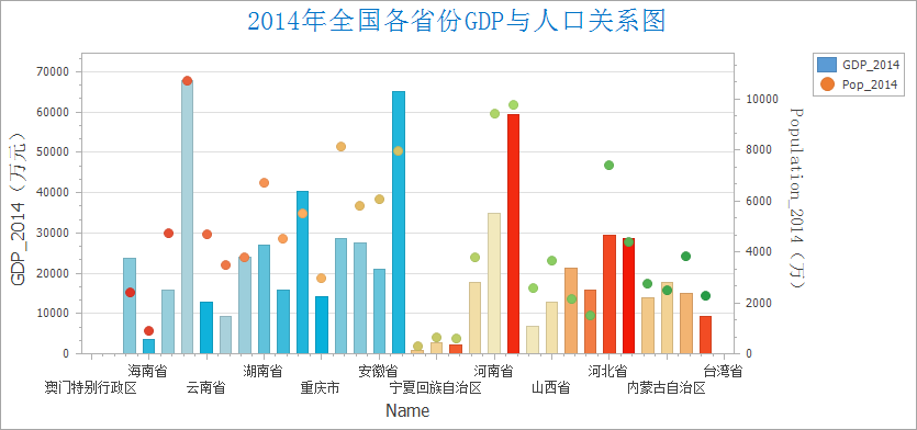 组合图表可以回答有关数据的问题,例如:2014年全国各省份GDP与人口之间的关系。