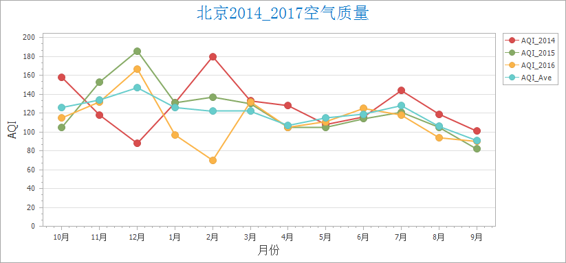 线形图表的特点是能够显示数据的变化趋势,反映事物的变化情况。例如:北京2014-2017年每月的空气质量折线图。如下图所示: