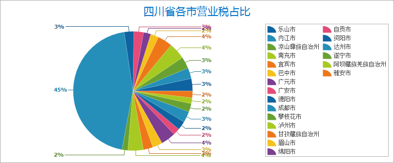 常用于表示部分在总体中所占的百分比。易于反映出部分与部分、部分与整体之间的数量关系。例如:下图所示为四川省某年各市营业税的占比。