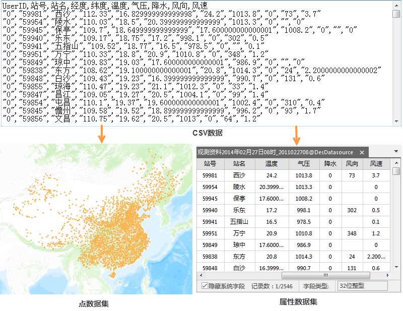 - 设置完成后,单击导入按钮,执行导入 CSV 文件的操作。导入后的点数据集或属性表数据如下: