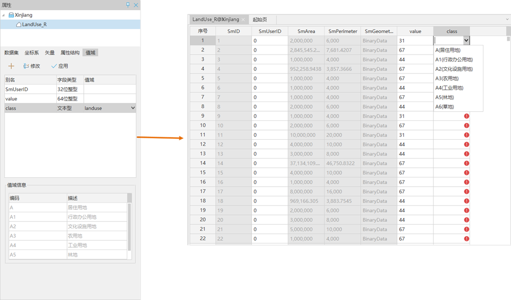 单击属性面板中值域项,面板将单独显示该矢量数据集字段的值域信息,包括矢量数据集的字段别名、字段类型、字段的具体值域信息。