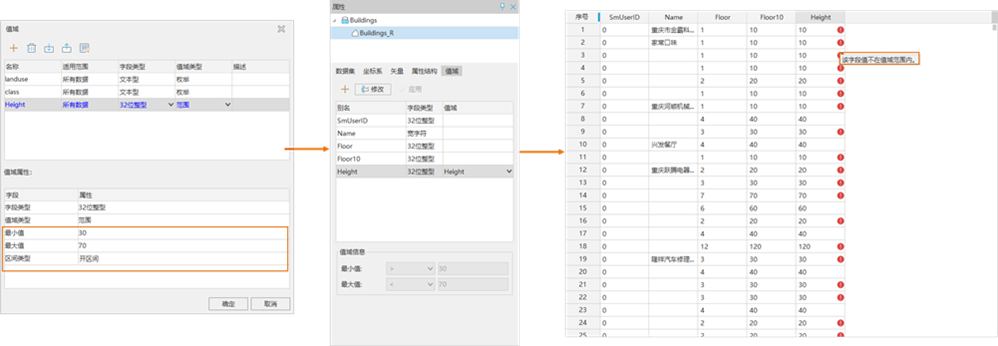 - 范围:设置数值型字段的值域类型为范围后,在对话框中值域属性列表中设置字段值的最大值、最小值和区间类型即可。在属性表中编辑字段单元格值时,输入的数值只能在该值域范围内,若超出范围,则提示该字段值不在值域范围内!。只有字段类型为数值型,值域类型才可以设置为范围。