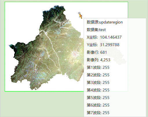 答:使用栅格查询功能,位于空间分析->栅格分析->栅格查询。单击栅格查询,鼠标移动到影像无值区域,即可看到影像每一个波段的栅格值,如下图所示。