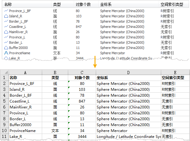 - 导出内容到表格:单击工具栏中的导出内容到表格按钮,可将当前窗口中的显示信息导出为*.xlsx,*.csv或*.xls文件。如下图所示,将工作空间视图中某数据源的数据集信息导出为表格文件。